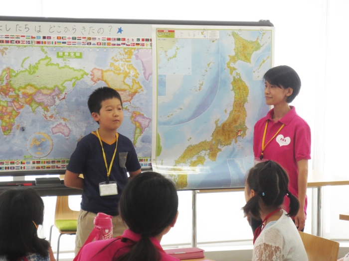 もう一つ、今年のセミナーの特徴があります。それは参加者の中に、フランスからの留学生や、アメリカ人のお父さんを持つ子ども達の参加、さらには富士山の麓からの参加者など、さまざまな場所から参加してくれたことです。そこで、自己紹介は、世界地図と日本地図に、自分の出身地を指し示しながら行いました。お箸の文化の日本と、フォークとナイフの文化の国の食事の食べ方も、互いに教え合うことができました。