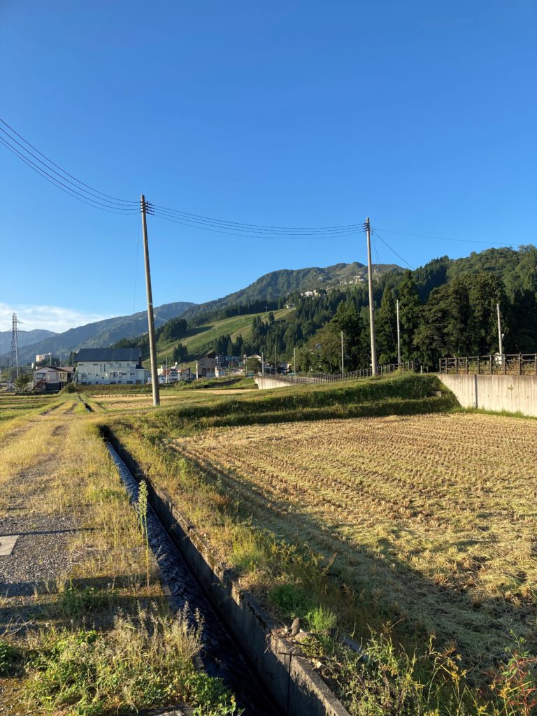 写真は稲刈りの終わった田んぼと右奥に見えるのが舞子スキー場です。空がとても青くきれいだったので撮りました。