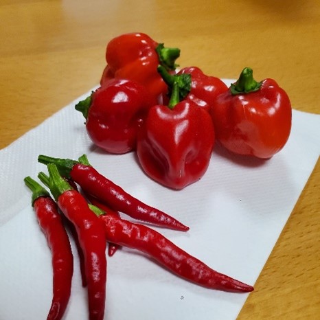 赤唐辛子の苗を買いに行った夫が、たまたま見かけた「ハバネロ」の苗を試しに1本購入し植えてみたところ、どんどん成長し夏にはきれいなツヤツヤした赤い実がたくさん収穫できた。