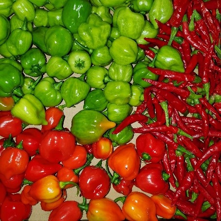 秋のハバネロと赤唐辛子。虫に食われはじめたので緑のままで収穫した