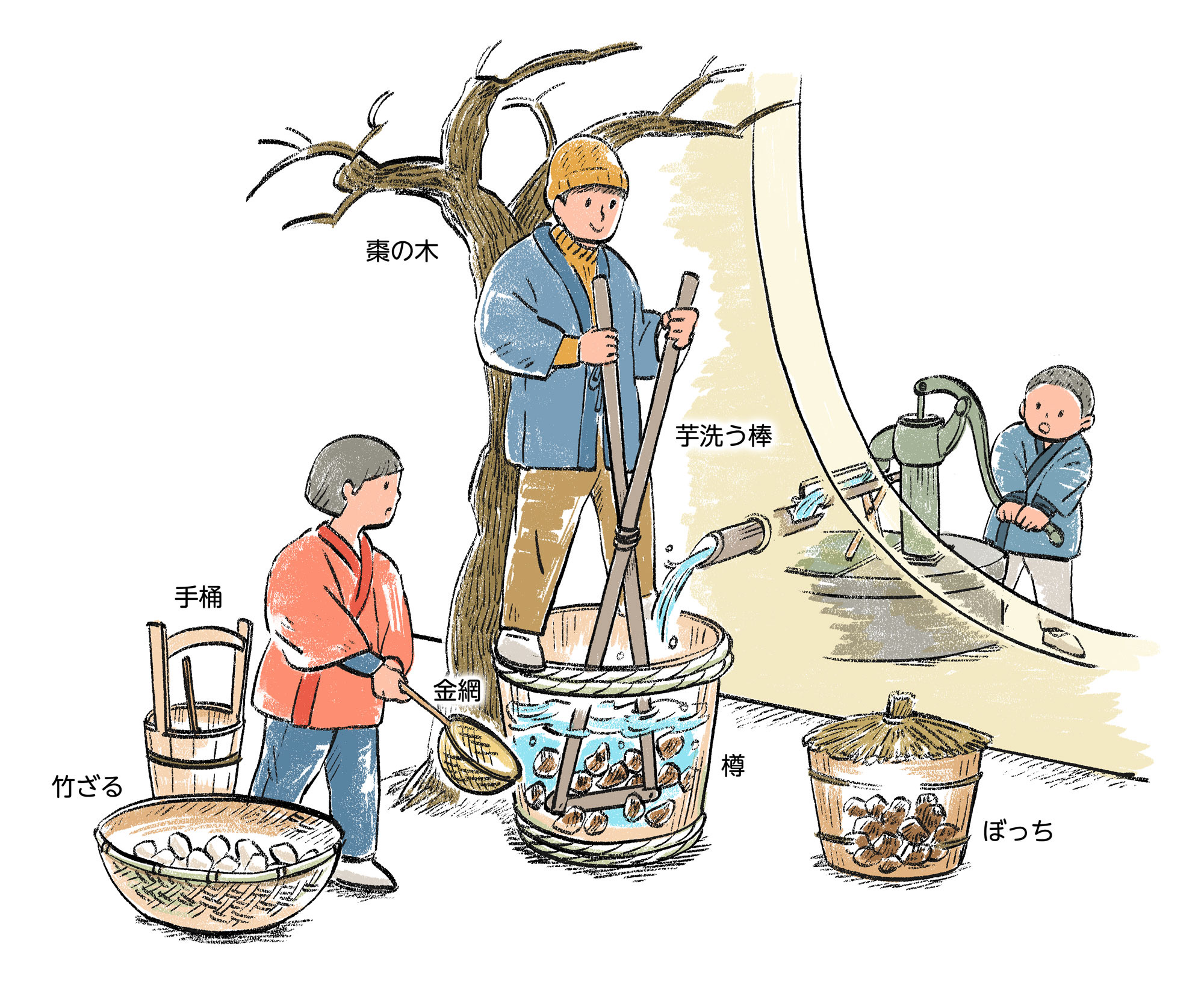 イラストは、その頃の暮・正月用の芋洗いの手伝いの様子である。兄が言いつけられた手伝いだが、兄一人ではできない、つまらないので、私と弟を動員する。竹やぶの地下深い壕に保管された芋、15kgは入っていたと思われるぼっち(寒さに弱い芋の保存のために稲藁製の米俵と同じ仕立ての蓋つきバケツ)を取り出すことからはじまる。外流しで土を洗い流してから、四斗樽で何回かに分けて洗う。作業は分担と協働。棗の木を背もたれにして樽のふちに乗って(棒の上部を持つ方がテコの原理で楽に動かせるため)棒で芋をゴロゴロと動かす役、水屋の井戸から壁を通した樋から水を汲む役、ゴロゴロして芋から外れた毛(外皮)をすくい取り、芋が白い肌になったら流水で洗い竹ざるに上げて水気を切る役である。縁側に畳表のゴザを敷いて芋を並べるまでが手伝い。その後は大人たちが、1、2日天日乾燥し、油紙に包んで保管し用いていた。芋を洗うことは、芋が白い肌になる“こそげる”(毛のついた外皮を剥く)ことでもあったことを理解した。余談だが、私の調理の出発は、このような多くの手伝いを、兄弟で協力し工夫・冒険を重ねながらなし遂げた楽しかった体験にあるようだ。