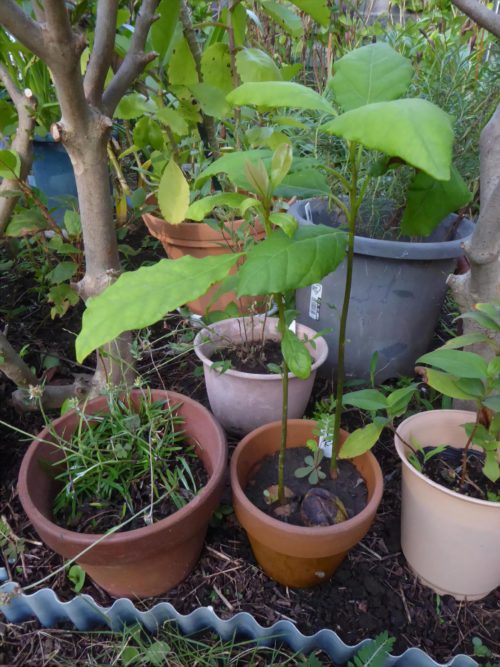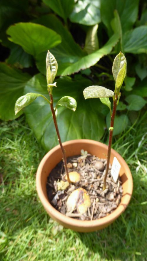 昨年(2021年)7月、庭で水やりをしていたら、何かの発芽に気づきました。好きで紫陽花は積極的に挿して株を増やしてきましたが、それ以外は気まぐれな対応なので、いつの間にやら素性のわからない鉢が増えています。たまたま名札があり、アボカドとわかり驚きました。