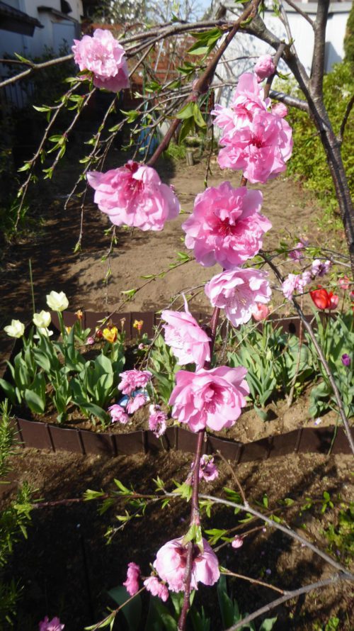 さて、種の生き残りをかけた生命力にも魅せられています。我が家の【紅白混じりの枝垂れ桃】は亡義父が植えた親木が枯れそうになり、子孫を残そうと何回挿し木をしてもつかず、いよいよか? というときに初めて50個ほどの実をつけたので、土中にそれらを埋めました。こだわっていたわりには雑な対応でした。そしてこれもすっかり忘れたその翌年に、雑草と思って抜こうとしたのが幼木でした。