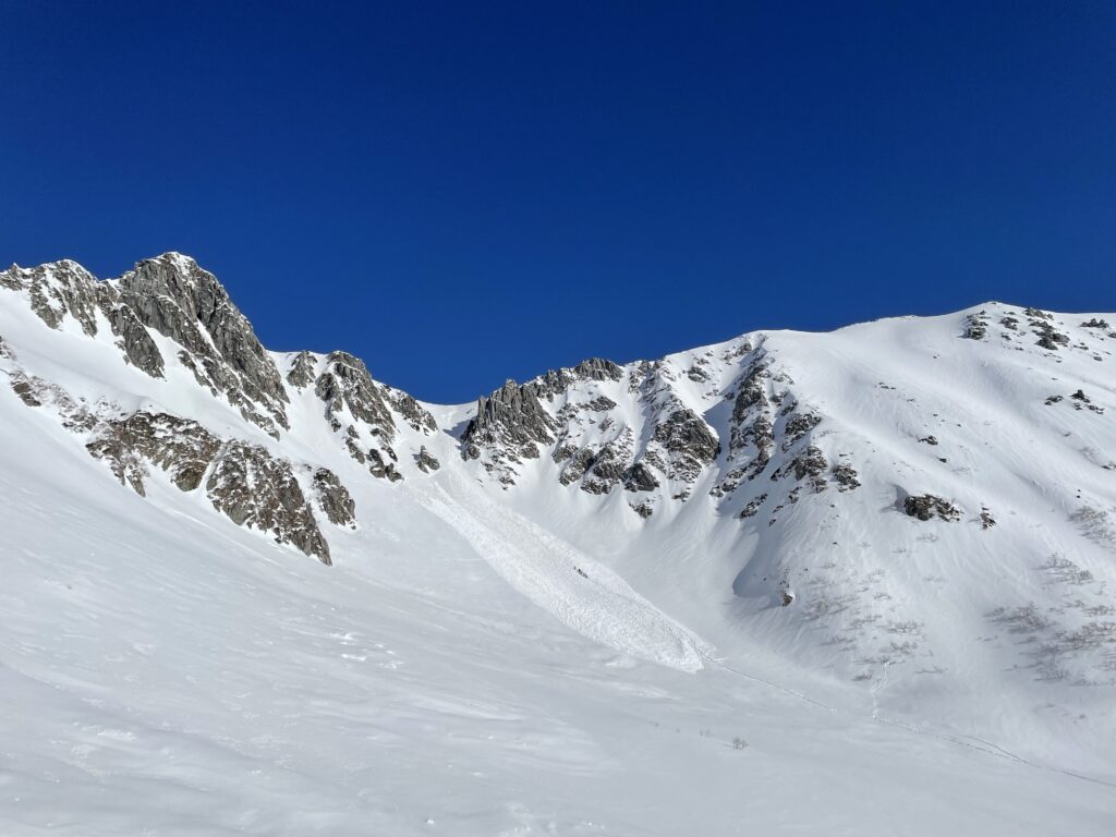 3月下旬とはいえ、標高2,612mの千畳敷カールは一面の雪。ここ数日の暖かさで前日には雪崩があったらしく、そのあとがくっきり残っています。この日のために、数十年ぶりに12本爪のアイゼンとピッケル、ヘルメットを購入しました。