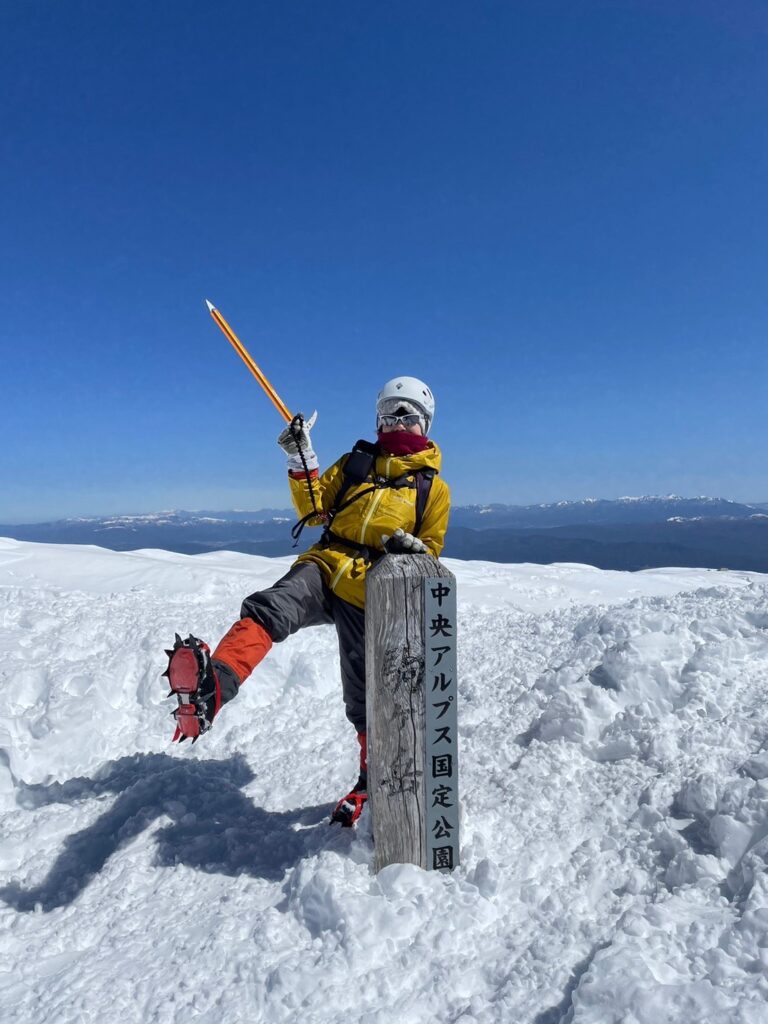 急登を登り切り乗越浄土からは、稜線歩きになります。風が強く寒さを感じ、改めて雪山にやってきたと実感。西風を受けながら、2,925mの中岳山頂に到着しました。ところどころ岩肌が出ているので、アイゼンが引っかからないように慎重にすすみます。目の前には、目指す木曽駒ケ岳が、「待ってるぞ」とそびえていました。