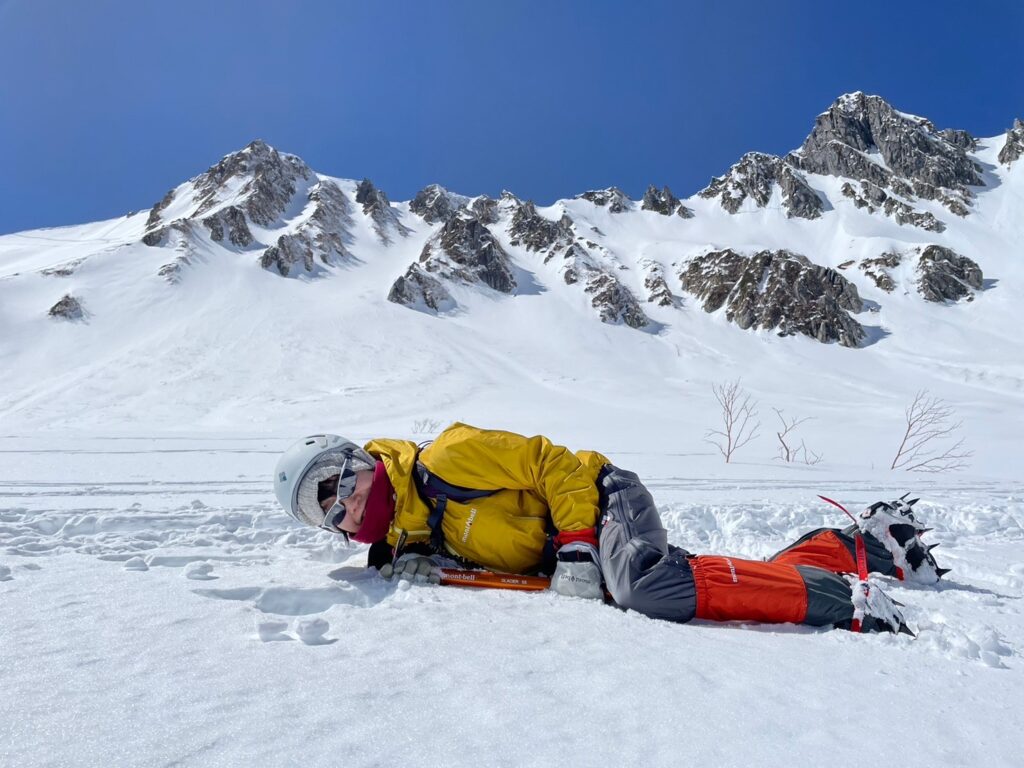 で、最後はお遊び雪訓(雪上訓練)。キャーと言いながら滑落して、ピッケルを雪面に突き刺し停止するというもの。30年前の雪訓を思い出しながら、楽しいひとときでした。