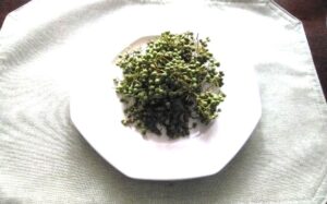 ①小枝から実山椒の実を外し、ざっと洗って水気をきります。実を小枝から外すとき、臭いやあくが手につくのが嫌なときには、ポリ手袋をするとよいでしょう。細い小枝は取り除いた方が、口当たりが良いとは思いますが、めんどくさい場合はとらなくても構わないと思います。
