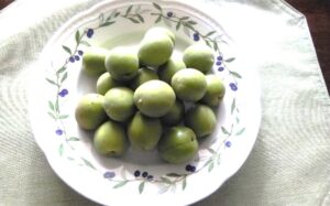 ①まず青梅は水で洗い、ようじでなり口についているヘタを取り除きます。梅の表面全体に縫い針の先で軽く穴をあけていきます。これは、煮ているときに皮が破れなくするためです。