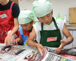 第28回子ども自身がリーダーになる食育セミナーが、川越市の社会福祉法人健友会みなみかぜ地域交流センターで、2012年8月6日(月)から7日(火)の2日間開かれました。このセミナーは長い間、宿泊で実施してきましたが、第27回セミナーより日帰り開催になりました。内容は昨年度と同様に「さかな丸ごと探検」の学習も入ったセミナーで、参加者は子ども13名、お姉さん役やキッチン担当学生10名、教材・資料作成学生8名、大人スタッフ14名、地域の方々4名、計49名でした。