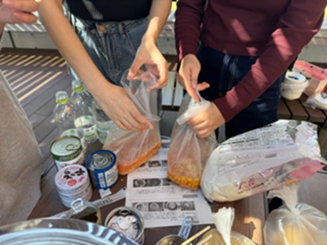 とりあえずポリ袋調理法で、いくつかの料理を作ってみました。チキンライス、パスタ、焼きそばなども作れることに学生は少し驚いていたようです。1人分ずつを作るのであれば、このポリ袋調理法は最小限の水で作ることができ、簡単であることを実感してくれました。