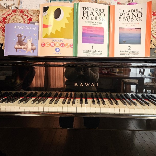 レッスンを受けはじめてみると、ピアノに触れることが楽しいだけでなく、その音色も心穏やかに素敵に聞こえ、生活に彩りを与えてもらっています。また、毎日短時間ですが継続して練習すると、リラックス効果もあり、改めて音楽のすばらしさが身に染みます。楽譜は、初心者の私でも適切な指使い(運指)を習得できるよう音符が大きく、見やすい子ども用の練習用楽譜を用意しました。また、誰もが知っている有名な曲を簡単に弾くことができるように編曲してある「大人のためのピアノ曲集」を選びました。