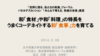 会員の活動報告 「ごはん食推進フォーラム」~世界に誇る、私たちの和食~ 会員名:足立己幸(フォーラム理事長)和「食材」や和「料理」の特徴をうまくコーデネイトする和「食事」力を育てる:「3・1・2弁当箱法」の提案2014年2月26日に、農水省主催の「ごはん食推進フォーラム」~世界に誇る、私たちの和食~ が開催され... 会員の活動報告