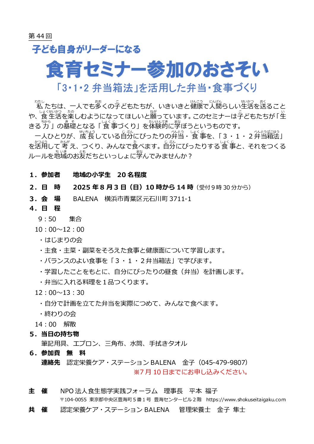 トピックス 第 44 回子ども自身がリーダーになる 食育セミナー参加のおさそい 「3・1・2 弁当箱法」を活用した弁当・食事づくり 2025年8月3日(日)、横浜市青葉区の認定栄養ケア・ステーション BALENAにて、地域の小学生を対象とした食育セミナーを開催いたします。(参加費:無料)詳細は添付pdfをご覧ください。参加お申し込みは、下記宛に、7月10日(木)までにご... トピックス研修会・セミナー
