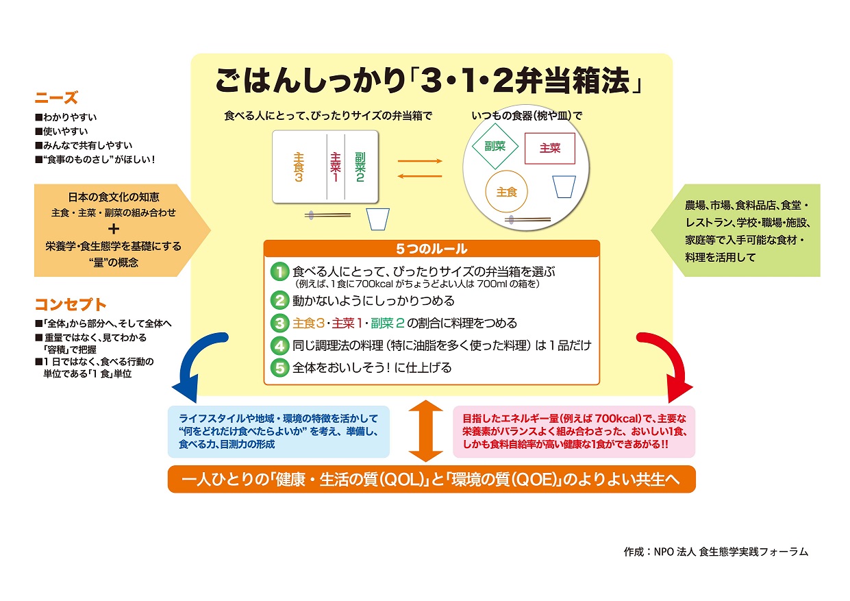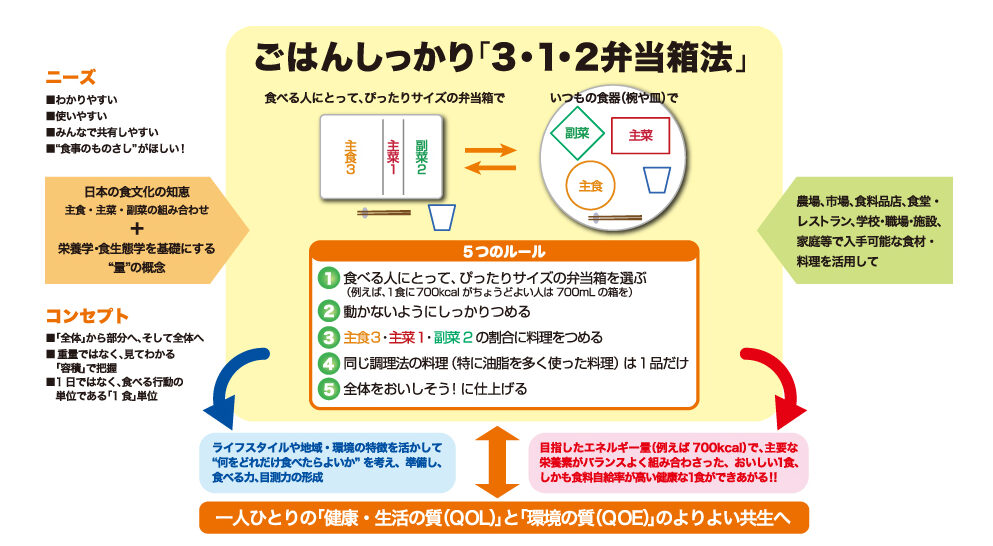 「3・1・2弁当箱法」は、“1食に何を、どれだけ食べたらよいか”について、だれでも理解し、実行し、多くの人と共有しやすいように、実践・研究開発された食事(料理の組み合わせ)のものさしです。食べる人のからだに合ったサイズの弁当箱に、主食・主菜・副菜料理を3・1・2 の割合の容積比(表面から見ると面積比)でつめると、適量で栄養素のバランスがよく、味・くらし・環境面からも、すぐれた食事にすることができます。だれでもマイペースでつくることができるように、「5つのルール」でキーポイントを示しています。