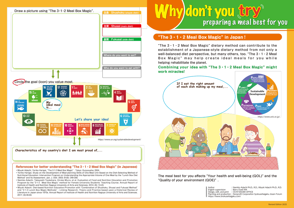 - 足立己幸.「料理選択型栄養・食教育」、主教材「食事の核料理(主食・主菜・副菜)を組み合わせる」・「3・1・2弁当箱法」による食事法:1970年代からの食生態学研究・理論・実践の環をふりかえり、現在の栄養・食問題解決の課題を問う.名古屋学芸大学健康・栄養研究所.2018;9:49-83.