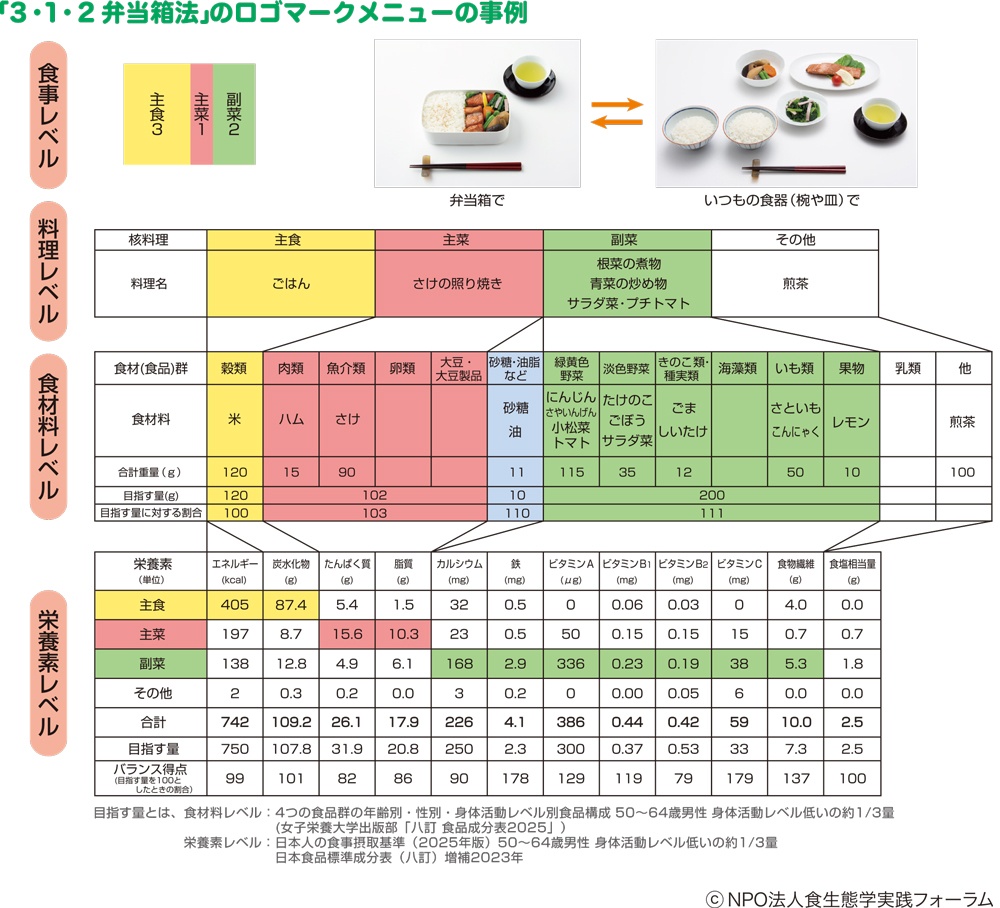 図2は、超簡単な「3・1・2弁当箱法」を基礎として作った食事内容が、多くの研究・実践の実績を重ねてきた栄養素レベル(食事摂取基準等)や食材料レベル(食品群や食品構成)と整合性があることを数値で示しています。同時に、学習者や活用者がそれぞれ使いやすいレベルを、状況に応じて選択的に活用できる可能性を示します