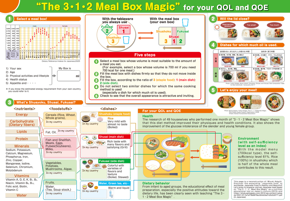 - 足立己幸.「3・1・2 弁当箱法」は“何をどれだけ食べたらよいか”の具体的なイメージ形成を期待して誕生したはずーしなやかに展開する第Ⅲ期を迎えて、原点を問う. 食生態学ー実践と研究.2013;6:2-5.